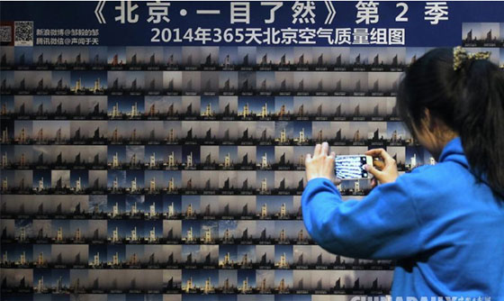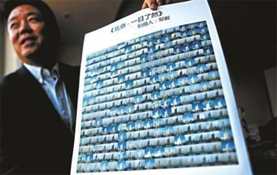 ??????? 鄒毅每天拍攝同一場景一張,組圖365張,讓大家一目了然看到北京的365天的天氣情況,呼吁公眾保護環(huán)境。這是他連續(xù)第二年以同樣方式記錄北京的天氣狀況。市民用手機拍下鄒毅的《北京·一目了然》第2季。