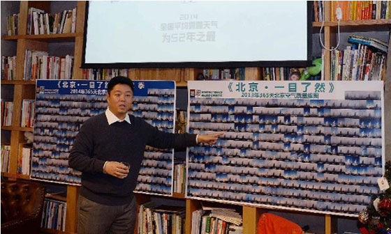 ??????? 這是鄒毅拍攝和拼版的2014年“一目了然”系列照片。鄒毅用2013、2014兩年時間,在同一地點、同一時刻用手機拍攝照片,記錄天氣變化狀況,并將兩年拍攝的700余張照片按年份匯總在一起,希望通過直觀的影像反映北京空氣質(zhì)量變化,讓更多的人關(guān)注霧霾、關(guān)注環(huán)境保護。本次分享會是他首次將兩年的拍攝成果一起集中展示。